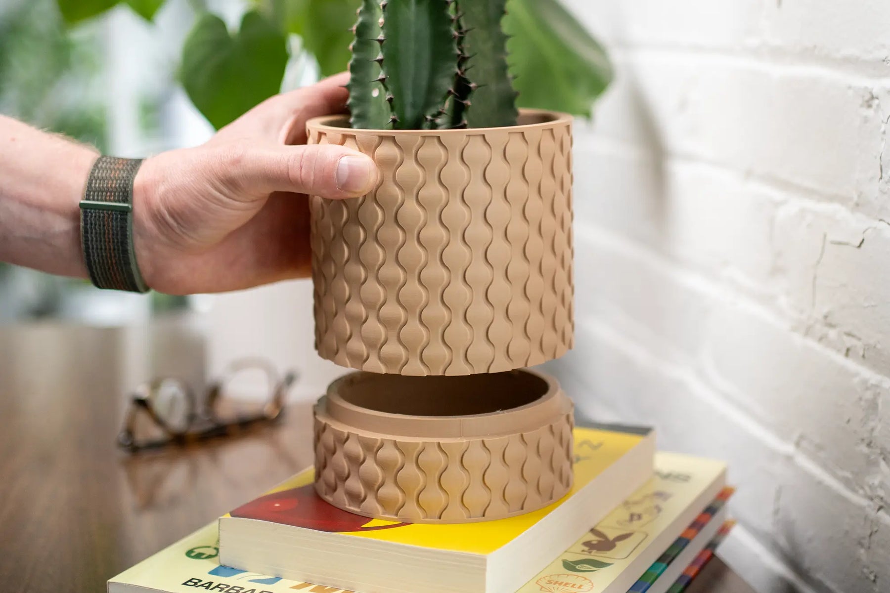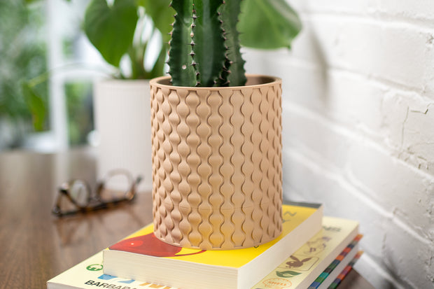 Inspired by the beauty of nature, the Raindrop Planter features a mesmerizing wavy texture that mimics the gentle rhythm of falling rain. Its cylindrical form is complemented by a warm, earthy tone, making it a perfect addition to both modern and rustic spaces. Designed to house your favorite plants in style, this planter adds depth and character to any setting, whether placed on a windowsill, shelf, or coffee table. Elevate your greenery with this unique and artistic piece that seamlessly blends texture and elegance.