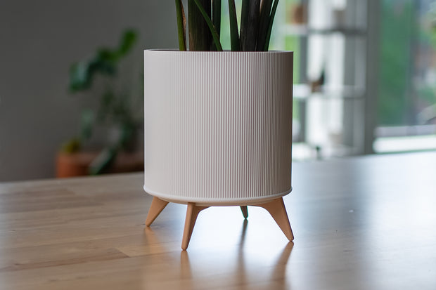 Elevate your indoor greenery with the sleek and modern Tyler Planter. Featuring a minimalist cylindrical design with delicate vertical ridges, this planter exudes contemporary elegance. The neutral-toned body is beautifully complemented by sturdy, mid-century-inspired wooden legs, adding warmth and sophistication to any space. Perfect for showcasing your favorite houseplants, the Tyler Planter seamlessly blends style and functionality, making it a stunning addition to any home or office decor.